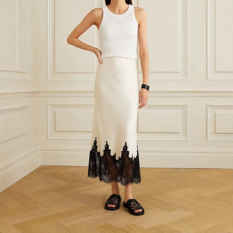 Make an elegant statement with this refined skirt that merges luxe satin with delicate lace-stitching and a fishtail silhouette. The hip-skirt design emphasises your waist and hips, while the fishtail hem gently flares for graceful movement. Available in classic black or white, this piece effortlessly transitions from a polished daytime look to chic evening wear.
