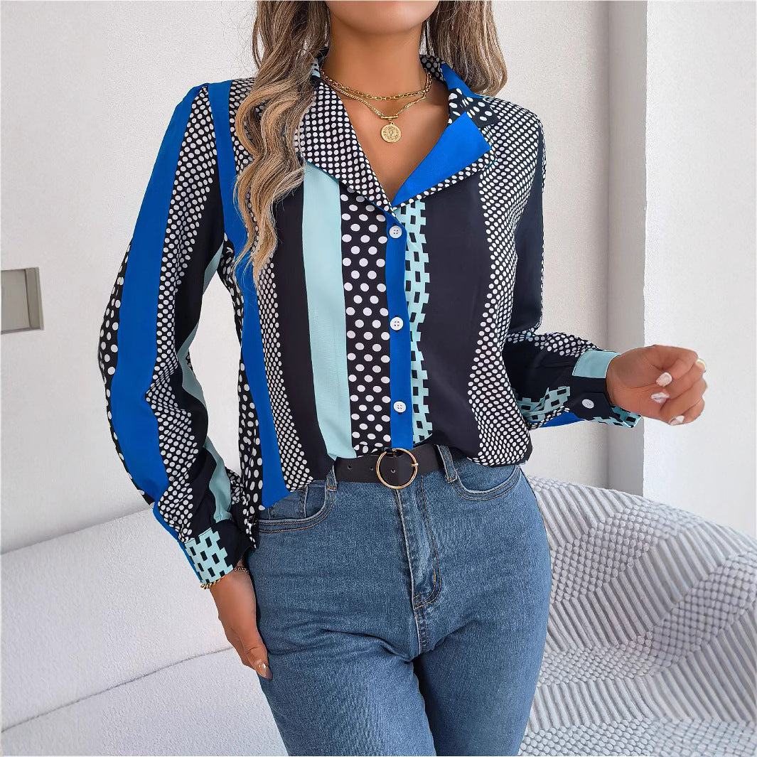 Product Information:- Style: Contrast color polka dot suit collar long sleeve shirt