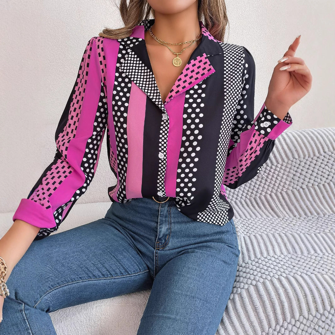 Contrast Color Polka Dot Suit Collar Long Sleeve Shirt