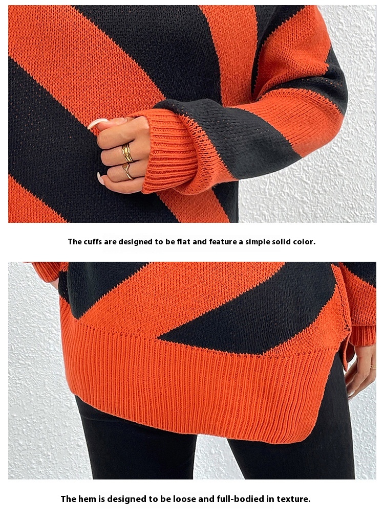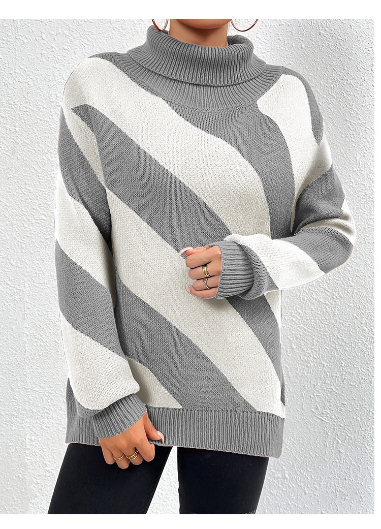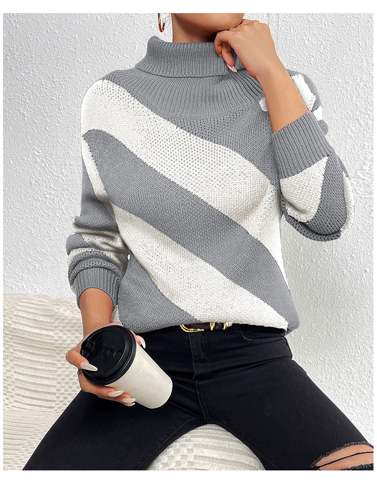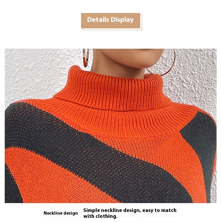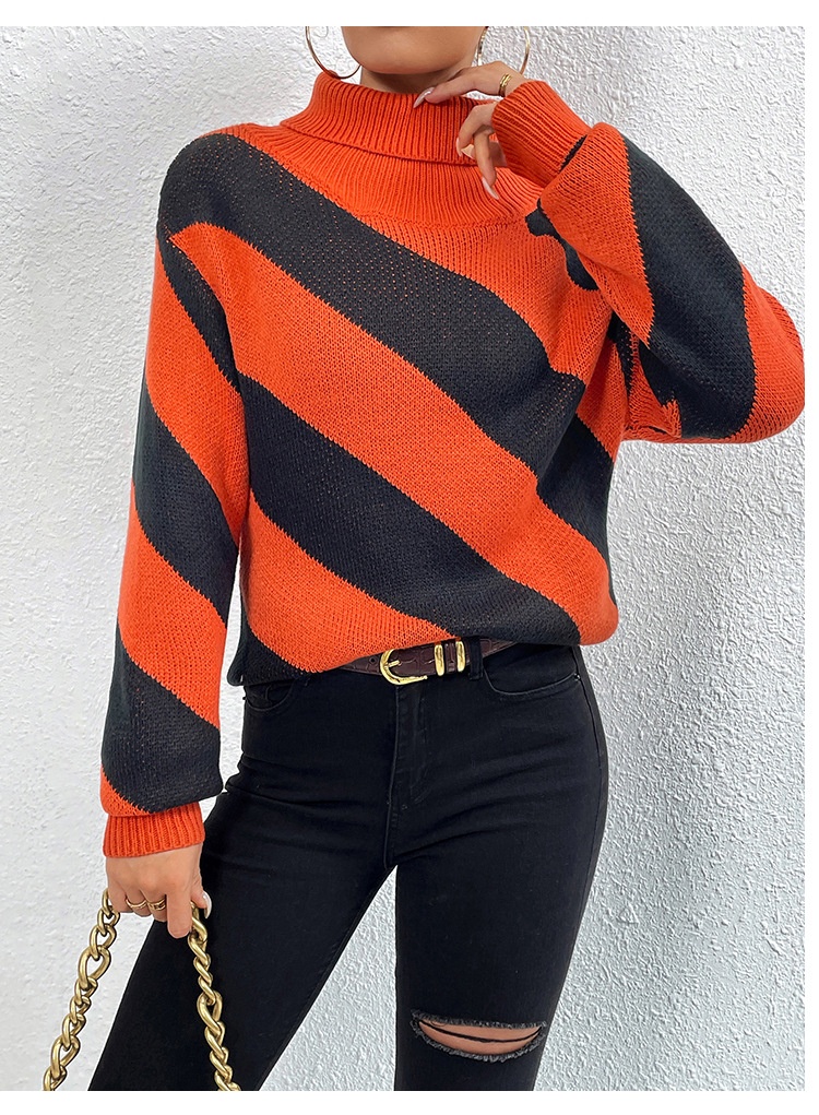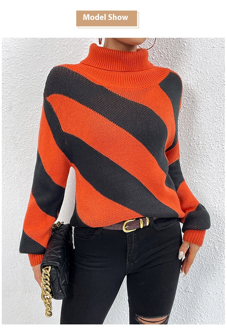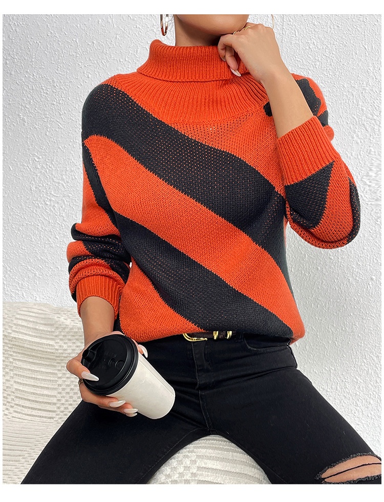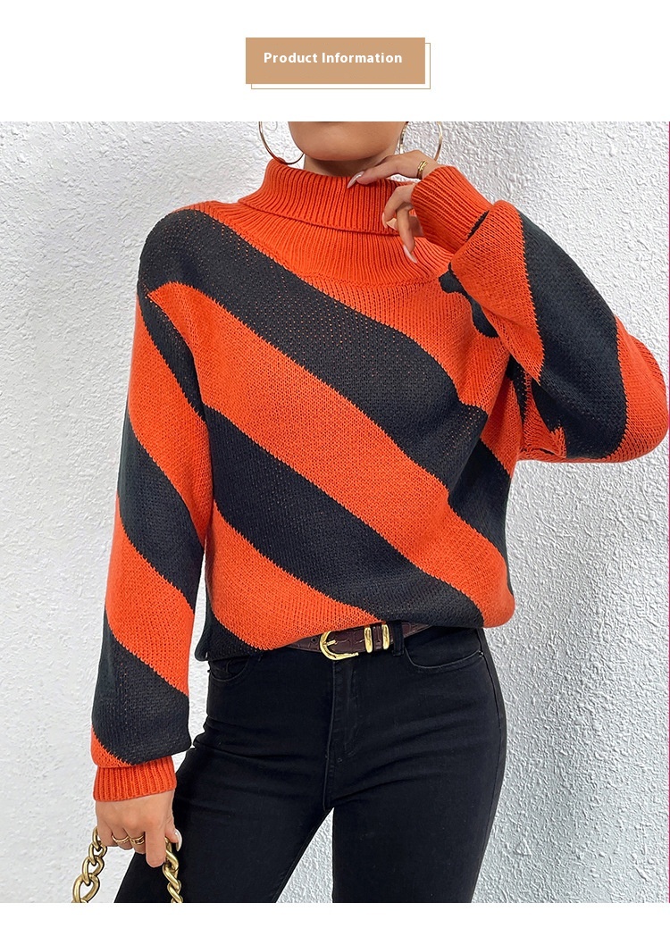Female Casual Contrast Color Diagonal Stripes Turtleneck Pullover